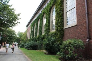 В 1954 году восемь университетов Америки объединяются в спортивную лигу. Название Плюща произошло якобы от одного из спортивных комментаторов, который смотря на скучную игру двух университетов сказал, что ему надоело смотреть, как растет плющ. Сравнение с плющом он привел потому, что многие здания этих университетов обвивает тот самый плющ. Отсюда и появился термин “Лига плюща”. На фото одно из зданий Гарварда. Обратите внимание на стены.