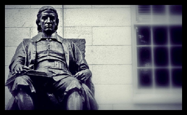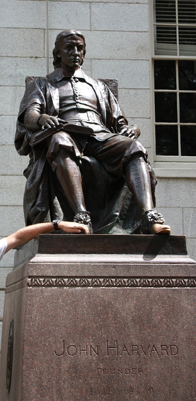 Первая. Когда в 1884 году создавался памятник Гарварду, то ни у кого не было изображения самого Джона Гарварда. Также не оказалось человека, который бы знал как он выглядит, поэтому случайно был выбран студент Sherman Hoar , который облачившись в одежды 17 века послужил моделью (кстати впоследствии Шерман добьется отличной политической карьеры в США). Таким образом на статуе совсем не Джон Гарвард.