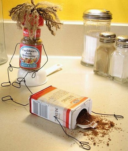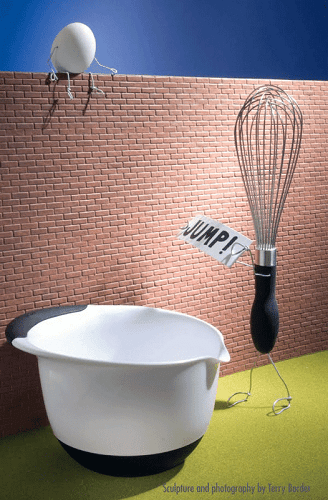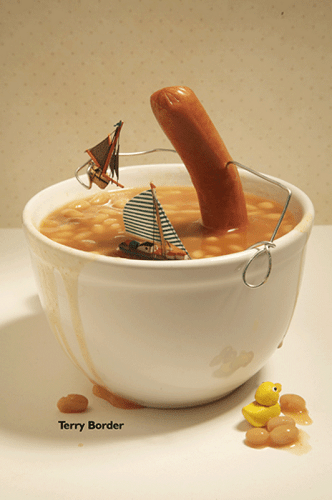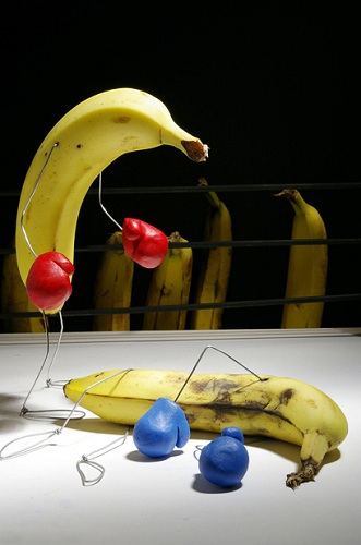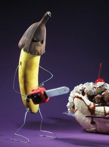 Буквально не давно увидел на одном из блогов ссылку на работы американского фотографа Терри Бордера. У него очень необычное хобби – оживлять различные продукты, фрукты с помощью проволоки и не больших предметов. Причем он не только превращает яйцо, банан или арахис в маленьких человечков, он создает целые образы и юмористические сюжеты.