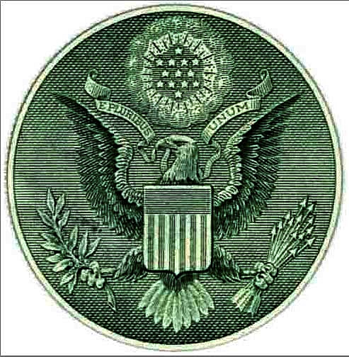 На обратной стороне изображена главная печать США (The Great Seal), которая состоит из деталей количеством 13.