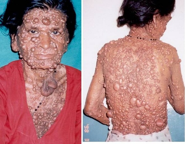 - The correct answer is C. This is Neurofibromatosis. The neurofibromatoses are genetic disorders that cause tumors to grow in the nervous system. The tumors begin in the supporting cells that make up the nerves and the myelin sheath–the thin membrane that envelops and protects the nerves. These disorders cause tumors to grow on nerves and produce other abnormalities such as skin changes and bone deformities (link).