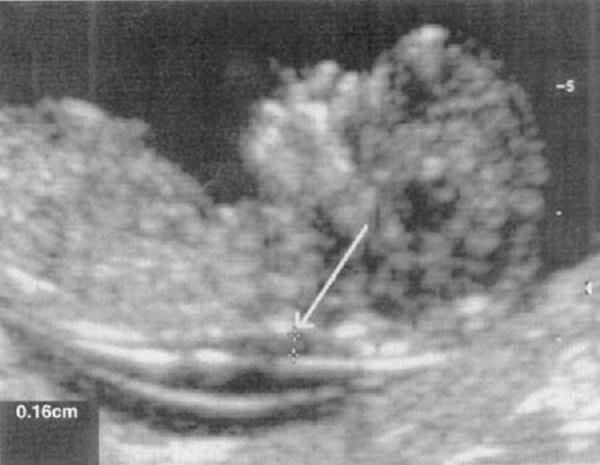 - The correct answer is B. The Down syndrome is suspected because the ultrasound shows increased nuchal translucency. According the pregnancy screen of women with suspected fetus with Down syndrome shown decreased alpha protein.