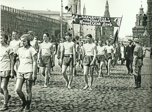 Молодежь отмечает Международный юношеский день на Красной площади. У людей во избежание позора отобрали лапти. Обратите внимание, что почти все босиком. Ну, что ж “с голой задницей”, но с очень гордым видом. Сейчас молодежь так бы не смогла. 1926 год.