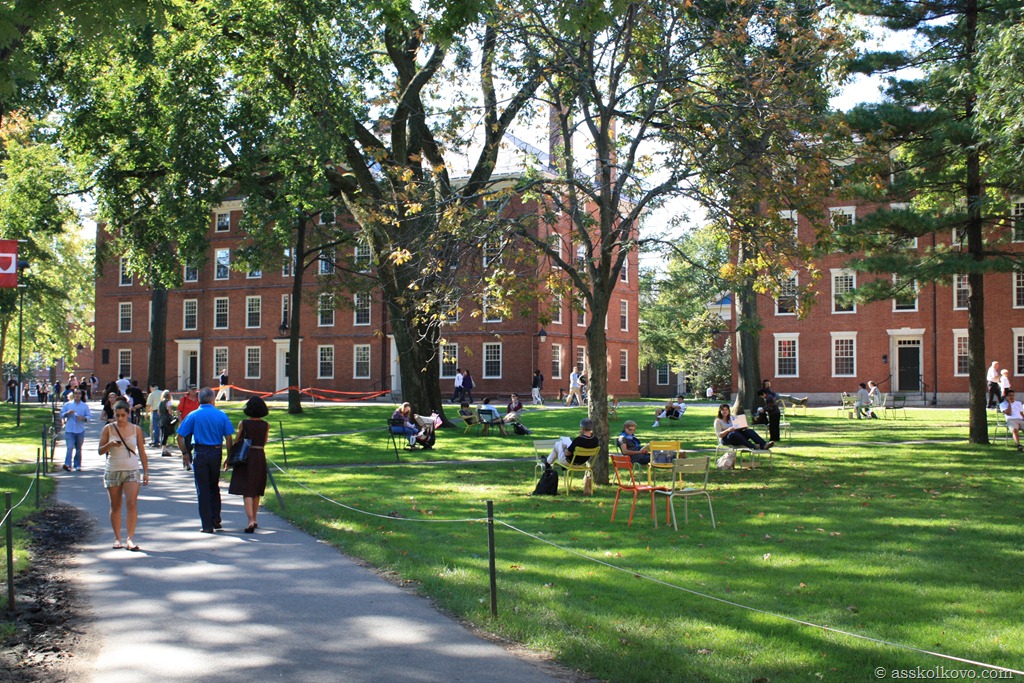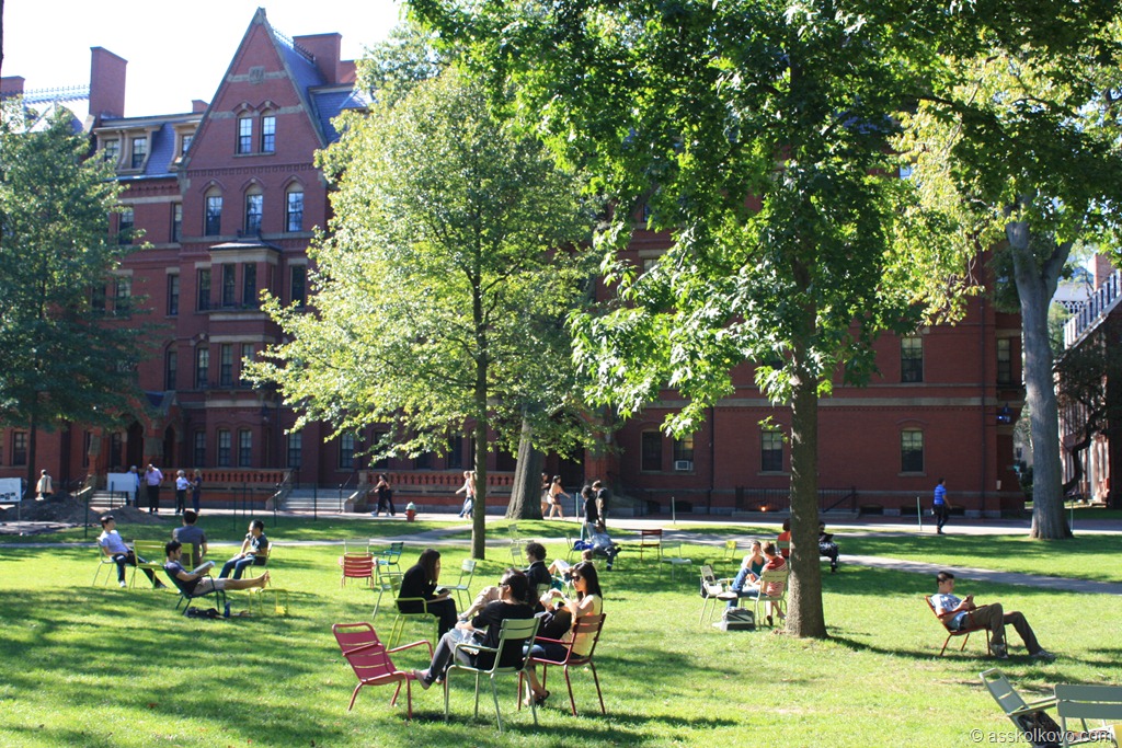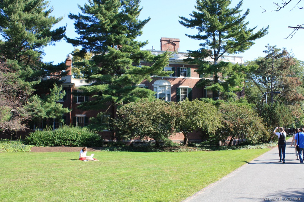 Очень приятно в теплый день почитать книгу на зеленой травке перед Джоном Гарвардом.
