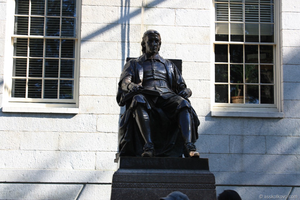 Памятник Джона Гарварда. О нем я уже писал в одном из своих постов. Перед этим монументом, ночью, пройдя огромное количество испытаний, принимают в свои ряды новых одаренных студентов в закрытый, Гарвардский клуб “Феникс”.