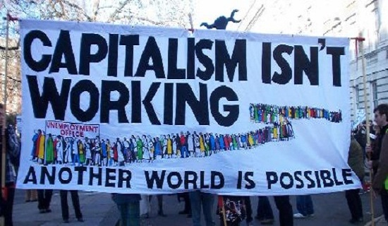 Вот от таких транспарантов, уже рябит в глазах. Их действительно можно встретить на каждом углу. Надпись: “Капитализм не работает”.