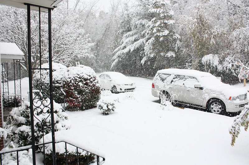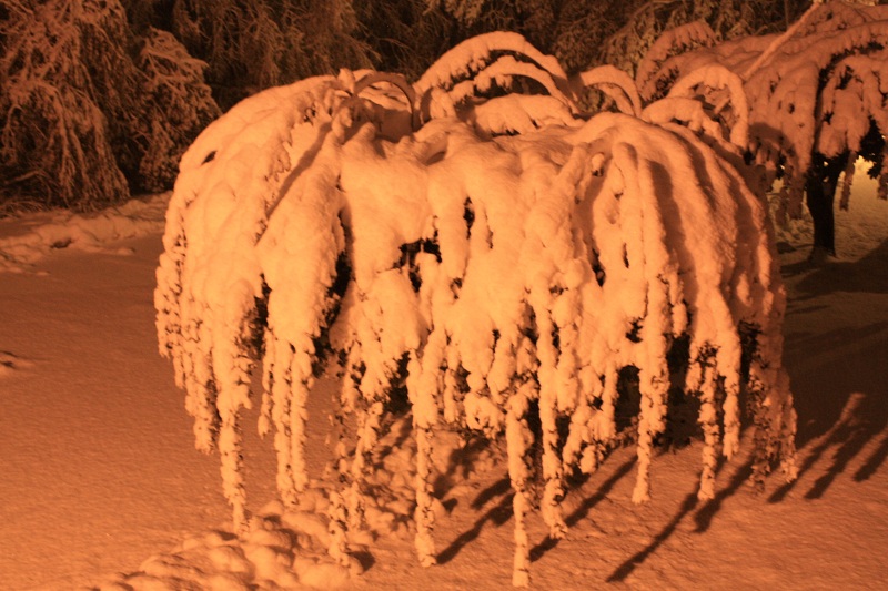 Задний двор. Деревья не сбросили свои листья, поэтому под тяжестью снега ломаются. Одно уже треснуло.