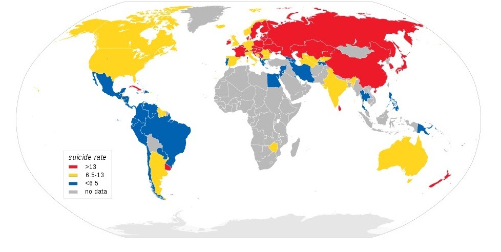 Согласно статистики ВОЗ, лидирует в списки суицидов Литва (42 самоубийства на 100 000), далее Россия (38) и Белоруссия (35).