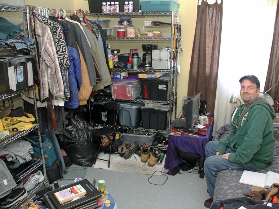Еще один резидент приюта – бомж Роб Аморузо. Он много читает и коллекционирует кепки (на заднем плане).