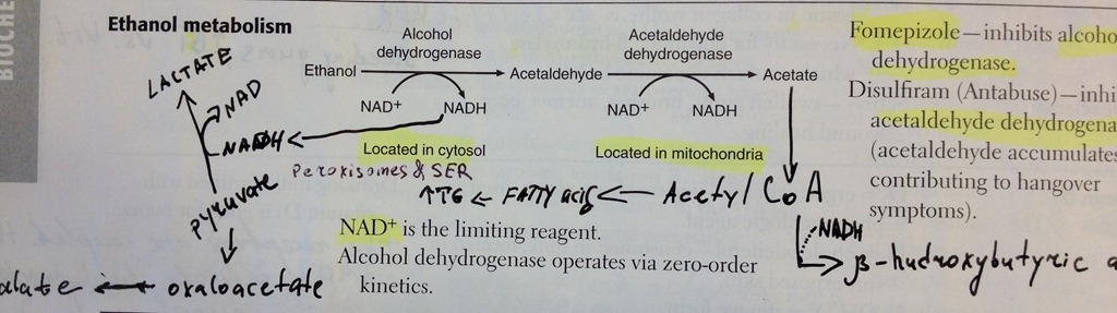 Теперь посмотри на картинку вверху. Метаболизм алкоголя происходит под действием алкогольдегидрогеназы с участием коферента NAD с образованием NADH. Я специально дорисовал к нему образование лактата из пирувата. Обрати внимание, что образование лактата происходит под дейсвием NADH, которого с избытком образовалось из алкоголя. Таким образом, избыток лактата приводит к сильному метаболическому ацидозу (это же кислота). Поэтому, физические нагрузки совместно с алкоголем подвергает наш организм серьезному стрессу и даже может вызвать смерть.
