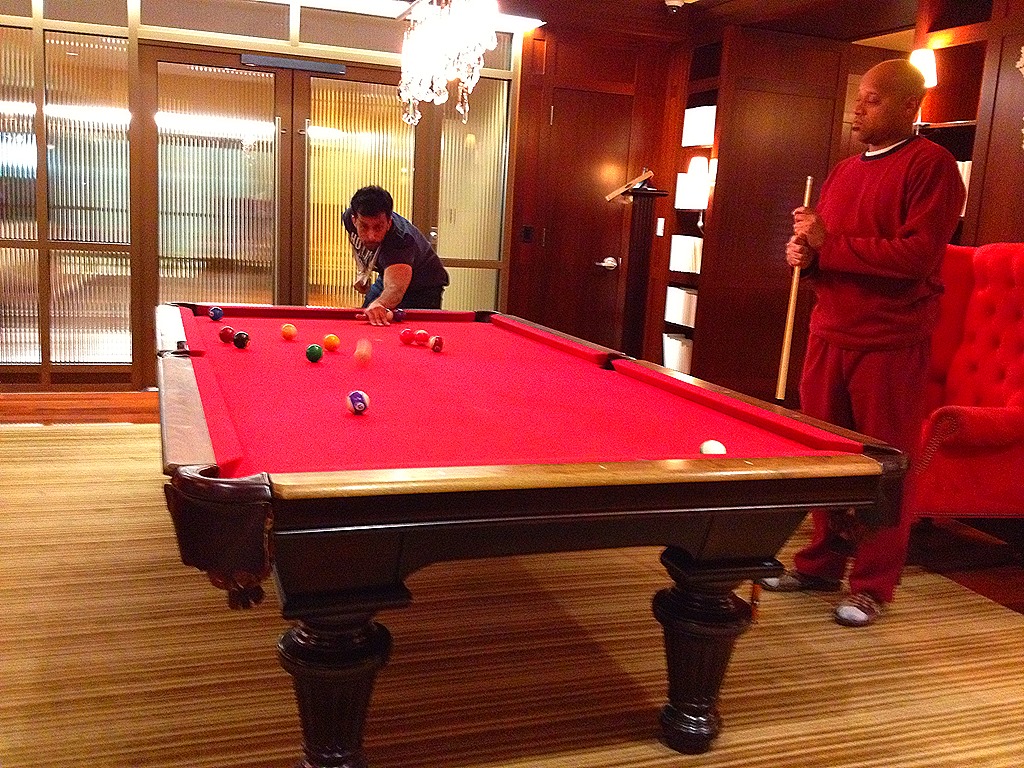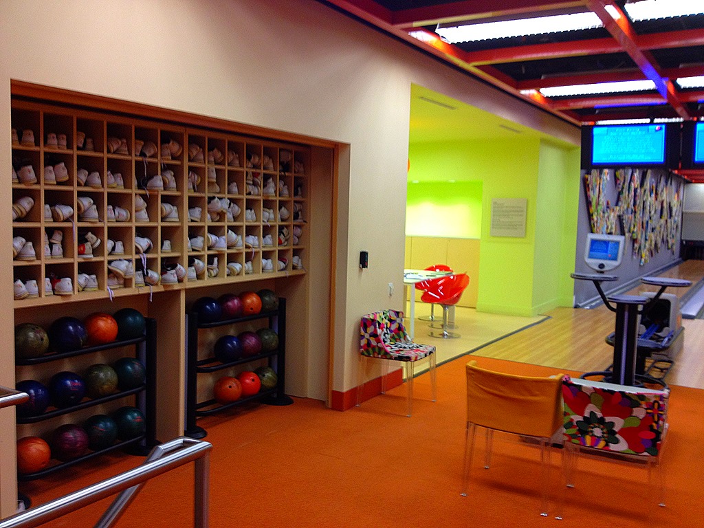 В подвале расположен боулинг. Любой может прийти и неограниченно катать шары .