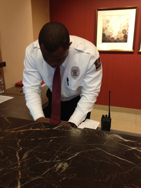 На входе мне открыл двери швейцар. Далее я прошел на ресепшн, где доложил к кому я пришел. Охрану нельзя снимать, поэтому пришлось вести съемку с “живота”.