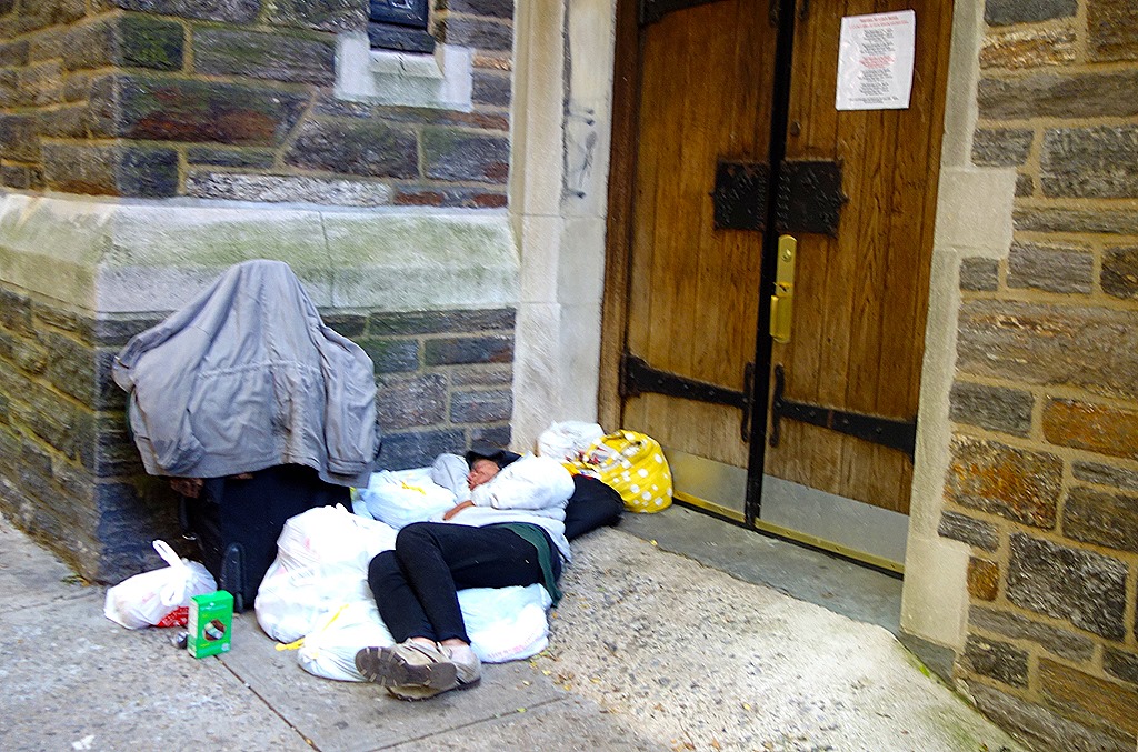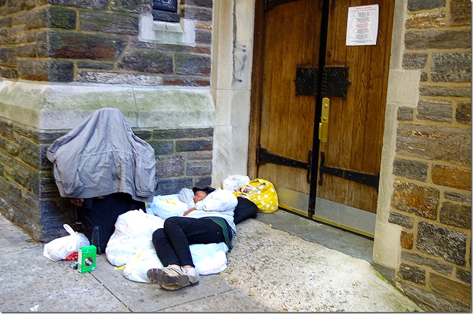 26. По-моему как раз у дверей ночлежки. Вход  с 19.00 и до 20.00. Кто не успел, спит на улице. Правила очень жесткие. Нельзя приходить пьяным, обязательно принять душ и переодеться. С утра накормят бесплатным завтраком, а дальше опять бомжевать. В Нью-Йорке есть даже бездомный, который ведет свой блог.