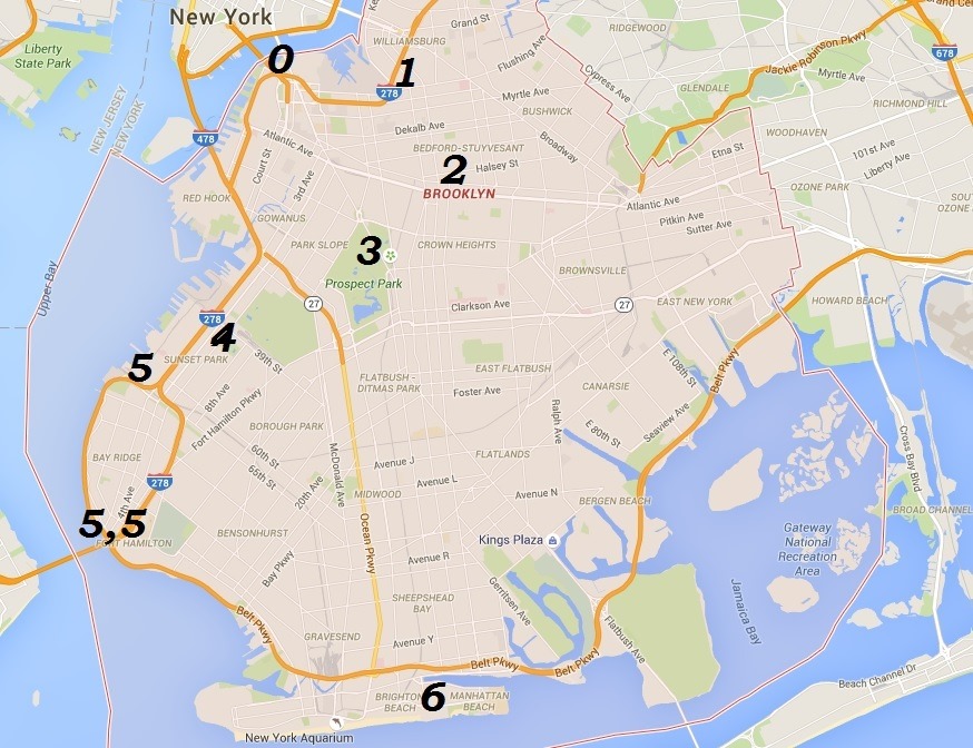 Я уже в прошлом посте начал рассказ о Бруклине с района Уильямсбург (на карте цифра 1), где большая часть жителей является либо хасидами, либо хипстерами.